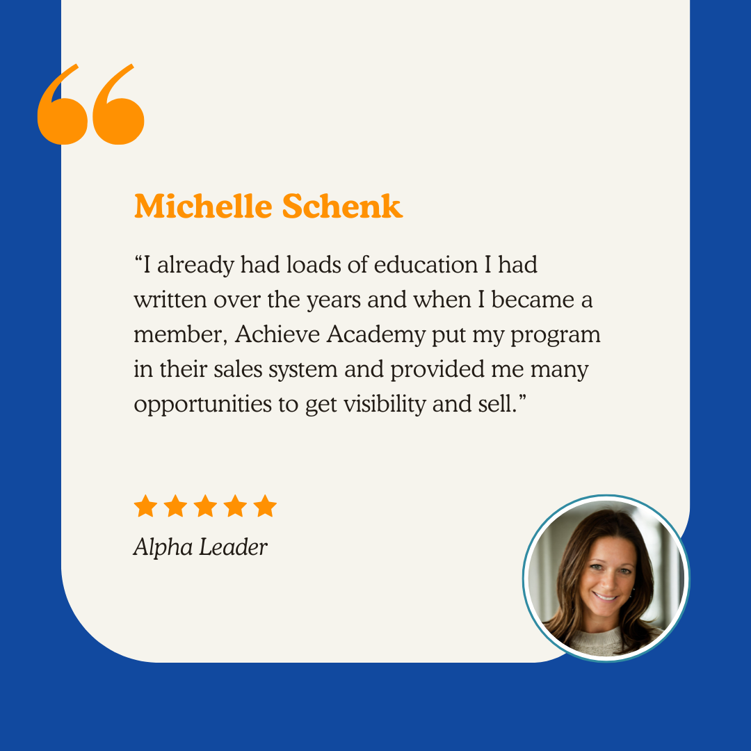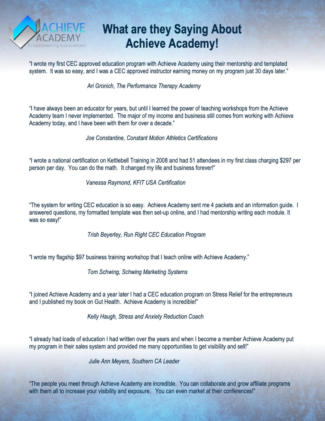 "We have taught workshops that had over 100 people in them and charged $497 per person earning almost $50,000.00 in one day. This is the power of having your own workshop, certification or master education program. Achieve Academy is here to help make this happen!"
